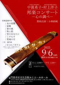 2025.08.08 お知らせ コンサート情報 中眞希子・村上洋子 邦楽コンサート -心の調べ- 2025年9月6日(土) 14:00開演(13:30開場) 門真市民文化会館 ルミエールホール 京阪電車「古川橋駅」より徒歩5分 大阪府門真市末広町29-1 【入場料】大人3000円・学生1500円 【曲目】 宮城道雄作品 水の変態・新暁・春と風・雲のあなたに・こすもす・荒城の月 3つのバガテル(三宅一徳) さらし幻想曲(中能島欣一) SHAREシェアする